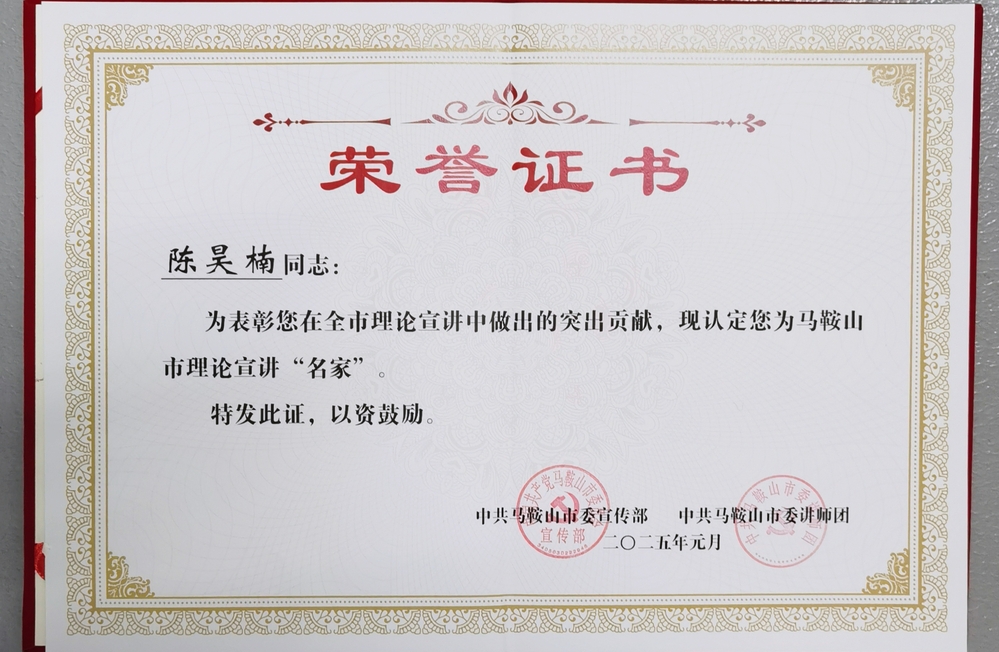 此次获评马鞍山市首届理论宣讲名家,不仅是对陈昊楠老师个人的肯定,更是对bevictor伟德官网理论宣讲工作的高度认可。未来,bevictor伟德官网将继续支持教师投身理论宣讲事业,为推动马鞍山市理论宣讲工作高质量发展贡献更多力量。(文图/陈昊楠 编辑/李青 审核/单守金)