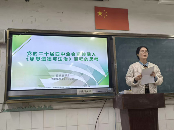 在课程融入交流环节,各教研室代表结合各自课程特点,围绕党的二十届四中全会精神融入思政课教学提出多样化思考。张春艳针对《毛泽东思想和中国特色社会主义理论体系概论》课程,按照“为何融”“融什么”“怎样融”逻辑展开,梳理党的二十届四中全会精神与理论体系的内在传承,凝练出“文本-理论”、“史论-案例”、“实践-体验”相结合的教学法。温晨婷围绕《思想道德与法治》课程,从“理论依据”与“路径方法”双维度,将党的二十届四中全会精神内核与课程目标的深度契合,结合不同专业员工的实际问题和认知特点,从学情分析、教学重难点把握、内容设计与案例运用等方面进行了融入分享。